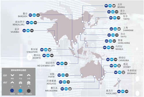 本次報告共覆蓋20個關(guān)鍵城市與地區(qū)的三類主要商業(yè)地產(chǎn)投資市場,其中8個城市環(huán)比資本化率有所波動。亞太地區(qū)工業(yè)市場的投資需求強(qiáng)勁,資本化率進(jìn)一步下調(diào)。澳大利亞的部分城市寫字樓資本化率有一定下降。