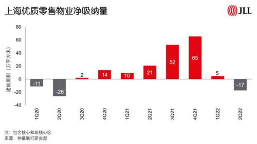 受到疫情影響,2022年一季度上海優(yōu)質(zhì)零售物業(yè)凈吸納量僅為5萬方,二季度的4、5月處于封控期,市場按下“暫停鍵”,而6月開始全面復(fù)商復(fù)市后,疫情影響開始顯現(xiàn)。據(jù)仲量聯(lián)行統(tǒng)計,二季度上海優(yōu)質(zhì)零售物業(yè)凈吸納量為負17萬方。其中,受沖擊最大的為餐飲業(yè)態(tài)及線下體驗業(yè)態(tài),包括影院、健身運動場館、線下娛樂游戲和兒童娛樂等等。