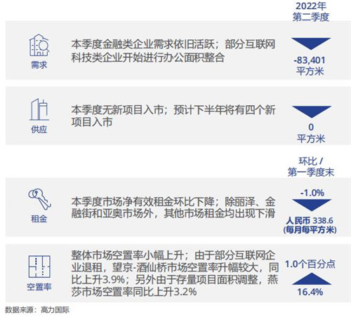 高力國際近日發(fā)布北京第二季度辦公樓報告。本季度北京再次經(jīng)歷了疫情襲擾,大量商務(wù)租賃活動受到影響。由于辦公樓租賃嚴(yán)重依賴線下帶看和商務(wù)談判,整體市場在二季度活躍度都大幅降低。高力國際華北區(qū)董事總經(jīng)理嚴(yán)區(qū)海表示,二季度北京甲級寫字樓市場的凈吸納量為-8.3萬平方米,是繼2020年一季度后第一次出現(xiàn)負(fù)值。本季度市場無新增供應(yīng),受到市場租賃活動放緩、談判周期延長等因素影響,整體空置率小幅回升到16.4%,市場租金也小幅回調(diào)至338.6元每月每平米。