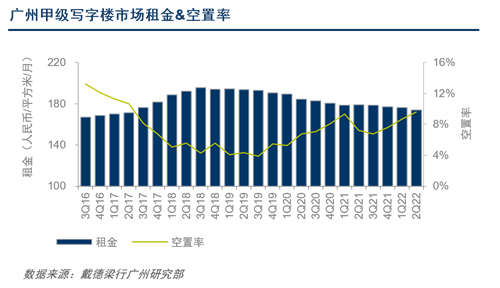 2022年上半年,廣州市甲級(jí)寫字樓市場(chǎng)錄得33.2萬平方米新增供應(yīng),超過去年全年供應(yīng)量的七成。盡管新增供應(yīng)持續(xù)放量,但由于上半年疫情在國(guó)內(nèi)多個(gè)核心城市多發(fā)頻發(fā),外部環(huán)境的不確定性令企業(yè)的租賃決策周期有所延長(zhǎng),新增供應(yīng)對(duì)市場(chǎng)需求的刺激作用有限。一線城市寫字樓租賃需求節(jié)奏普遍放緩,上半年廣州市甲級(jí)寫字樓市場(chǎng)錄得18.7萬平方米凈吸納量,是去年全年的44.0%。全市空置率延續(xù)上升趨勢(shì)至9.6%。對(duì)此,戴德梁行研究院副院長(zhǎng)、華南區(qū)研究部董事張曉端表示,盡管市場(chǎng)吸納水平不及預(yù)期,但對(duì)于廣州而言,在長(zhǎng)期維持低空置率的市場(chǎng)環(huán)境下,新興商務(wù)區(qū)持續(xù)放量帶來可租賃面積的增加,將為租戶提供更多可租賃面積的選擇,也為未來市場(chǎng)活躍度的復(fù)蘇提供良好載體。