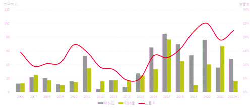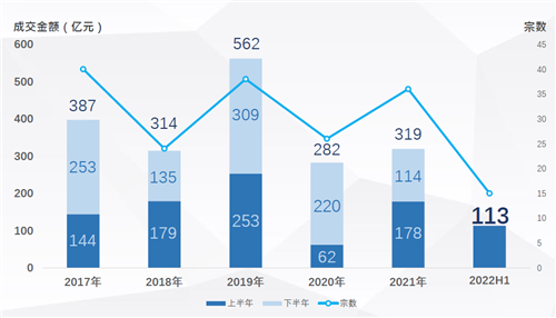 2022年上半年累計成交金額約113億元,同比下降近37%;同時,成交宗數(shù)15宗與去年上半年18宗相仿,顯示今年的平均成交規(guī)模進一步縮水,10億以內(nèi)成交額的交易為市場上的主流,占上半年總成交近九成。整體而言,上半年大宗交易市場延續(xù)了去年下半年以來的市場氛圍,收到全球經(jīng)濟不確定性持續(xù)以及上半年多地疫情反復的影響,投資者更加趨于謹慎保守。