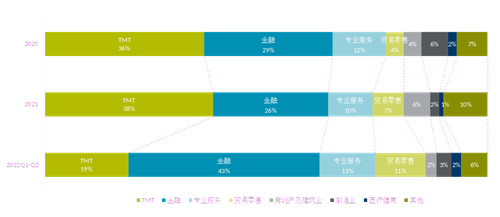 結(jié)合上半年全市的租賃成交來看,全市金融業(yè)租賃成交面積占比高達43.2%,國資控股企業(yè)依然在其中占主導地位,同時券商表現(xiàn)活躍。而TMT行業(yè)則由于進入深度調(diào)整期,租賃需求出現(xiàn)明顯放緩,上半年TMT行業(yè)成交面積占比僅為18.9%,較去年同期下降約18個百分點,平均租賃成交面積亦下降了44.8%。在TMT各細分領(lǐng)域中,半導體行業(yè)逆勢維持了較高的活躍度。