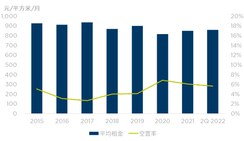 需求端來看,受到年初至今國內(nèi)多個主要城市出現(xiàn)疫情及大規(guī)模管控,經(jīng)濟大盤承壓和國際環(huán)境等多重因素影響,企業(yè)普遍趨于謹慎和理性,注重降本增效、精細化管理而不是粗放式擴張。近期的租賃實例中,除了延長免租期、裝修補貼等常見優(yōu)惠之外,出現(xiàn)部分企業(yè)在合同中加入保留擴租權(quán)的條款,在以較低的成本滿足當前辦公需求的同時,保留中短期便利擴租的權(quán)利。可見業(yè)主的租賃策略變得更加靈活,而對未來擴張抱有一定信心的企業(yè)在實際操作中也更為謹慎。在多重壓力之下上半年全市甲級寫字樓市場依然保持韌性,維持了相對平穩(wěn)的走勢,年中平均租金錄得每月每平方米209.1元,較上年末下降0.7%;空置率則上升3.2個百分點至22.4%。