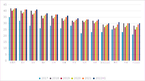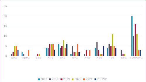 圖8:深圳市各區(qū)2017-2022年上半年工業(yè)用地出讓宗數(shù)統(tǒng)計