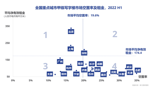 截至二季度末,全國重點(diǎn)20個(gè)城市甲級(jí)寫字樓市場(chǎng)存量約7,700萬平方米。市場(chǎng)平均空置率維持在19.6%,平均凈有效租金為174.4元每月每平方米。當(dāng)前,僅北京和上海同時(shí)有著較高的租金水平和較為合理的空置率。