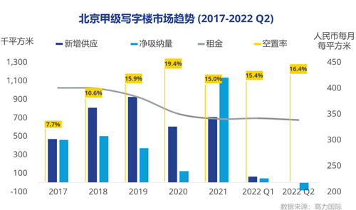 北京甲級(jí)寫字樓2022年上半年市場(chǎng)新增需求主要來源于金融類企業(yè)及國企。二季度受到疫情的影響,市場(chǎng)活躍度明顯下降,頭部互聯(lián)網(wǎng)公司的擴(kuò)張速度明顯放緩,空置率出現(xiàn)了環(huán)比小幅上漲。二季度受到需求放緩的影響,整體市場(chǎng)租金出現(xiàn)小幅下滑。