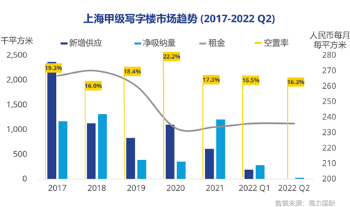 受二季度疫情影響, 2022上半年上海辦公樓市場(chǎng)凈吸納量同比去年同期下降36%。第二季度,上海辦公樓市場(chǎng)成交活躍度大幅放緩,空置率微幅下降,租金持平。上海國有企業(yè)為小微企業(yè)和個(gè)體工商戶提供租金減免,企業(yè)對(duì)新辦公空間的選擇表現(xiàn)謹(jǐn)慎。