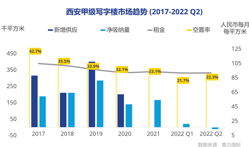 2022年上半年,西安甲級(jí)寫字樓市場(chǎng)活躍度降低,整體需求放緩,市場(chǎng)無新增供應(yīng),空置率較上年度末環(huán)比小幅下降,平均凈有效租金環(huán)比微降;ヂ(lián)網(wǎng)科技、專業(yè)服務(wù)及房地產(chǎn)和建筑依然是三大租賃需求主力。