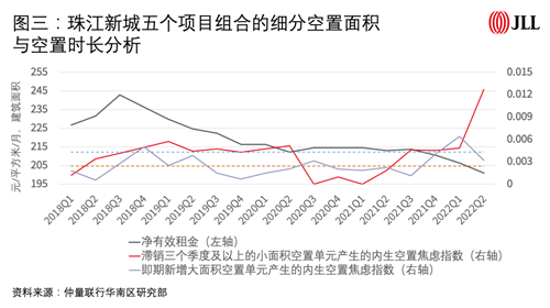 因此,仲量聯(lián)行華南區(qū)研究部在傳統(tǒng)的空間維度(項(xiàng)目總空置面積)之外,引入時(shí)間維度作為新的研究變量,定義出了一項(xiàng)內(nèi)生空置焦慮指數(shù)。具體而言,我們通過充分利用仲量聯(lián)行的大量歷史數(shù)據(jù),以定期追蹤的物業(yè)所有樓層和所有單元的空置情況構(gòu)建了一個(gè)復(fù)合指數(shù),以衡量業(yè)主因去化周期而產(chǎn)生的潛在利益損失,并以此分析空置去化周期時(shí)長與業(yè)主租賃壓力之間的關(guān)系。