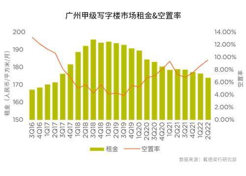 二季度,廣州甲級(jí)寫(xiě)字樓市場(chǎng)錄得15.4萬(wàn)平方米的新增供應(yīng)。全市總存量攀升至594.9萬(wàn)平方米。在新增供應(yīng)的影響下,全市空置率上升至9.6%。上半年多地疫情多發(fā),防疫管控措施趨嚴(yán)令市場(chǎng)需求節(jié)奏有所放緩,凈吸納量環(huán)比下降15.3%至8.6萬(wàn)平方米。全市平均租金環(huán)比下降1.4%至每月每平方米173.9元。