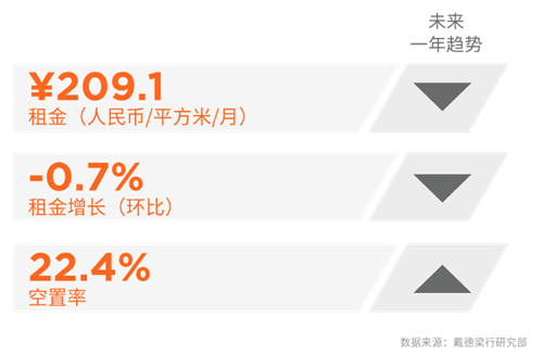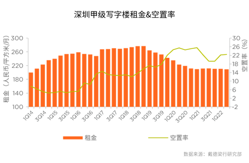 二季度,深圳迎來(lái)15萬(wàn)平方米的新供應(yīng)。疫情防控趨于穩(wěn)定,企業(yè)生產(chǎn)經(jīng)營(yíng)活動(dòng)逐步恢復(fù),寫(xiě)字樓市場(chǎng)活躍度亦有所復(fù)蘇。但受宏觀環(huán)境影響,企業(yè)普遍趨于謹(jǐn)慎和理性。多重壓力之下,甲級(jí)寫(xiě)字樓市場(chǎng)平均租金環(huán)比僅下降 0.7%至每平方米209.1 元,空置率僅微升 0.2 個(gè)百分點(diǎn)至 22.4% 。