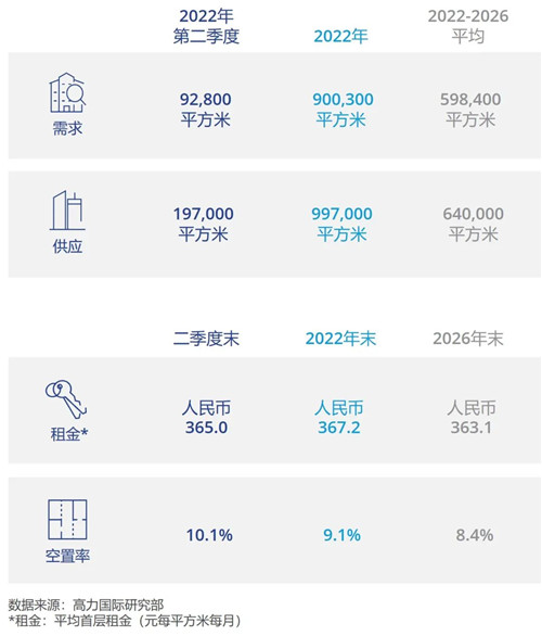 高力國際預(yù)計(jì)充沛的新增供應(yīng)將持續(xù)至2023年,今明兩年年均新增供應(yīng)面積或至98.9萬平方米;2022年全年新增供應(yīng)或?qū)⑦_(dá)99.7萬平方米。大源、天府新區(qū)、城東及金融城為主要的供應(yīng)區(qū)域;其中作為新興商圈的天府新區(qū),供應(yīng)端將在今明兩年發(fā)力,合計(jì)新增供應(yīng)面積或超50萬平方米。此后,我們預(yù)計(jì)2024年至2026年全市新增供應(yīng)將整體回落。