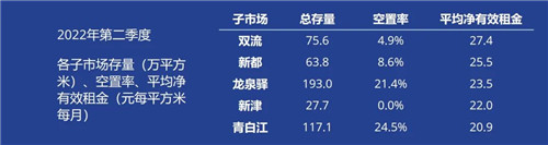 子市場(chǎng)方面,作為存量位列全市第二的青白江子市場(chǎng),空置面積得到顯著去化,半年環(huán)比下降4.1個(gè)百分點(diǎn)至24.5%;與此同時(shí),新津子市場(chǎng)空置率半年環(huán)比下降7.2個(gè)百分點(diǎn),目前處于接近滿租狀態(tài)。另一方面,新都空置率半年環(huán)比顯著上升,上揚(yáng)4.3個(gè)百分點(diǎn)至8.6%。