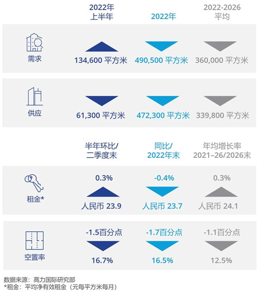 需求方面,第三方物流、傳統(tǒng)電商及新興零售表現(xiàn)活躍,上半年錄得凈吸納量合計(jì)13.5萬平方米,同比放緩。