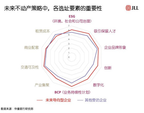 與三年前相比,目前企業(yè)在制定不動產(chǎn)選址策略時,除了關(guān)注傳統(tǒng)型因素(如租賃成本、交通可及性等)之外,還加大了對包括“ESG(環(huán)境、社會和公司治理)、公司品牌、人才保留、BCP(業(yè)務(wù)持續(xù)性計(jì)劃)”等戰(zhàn)略型因素的考量。