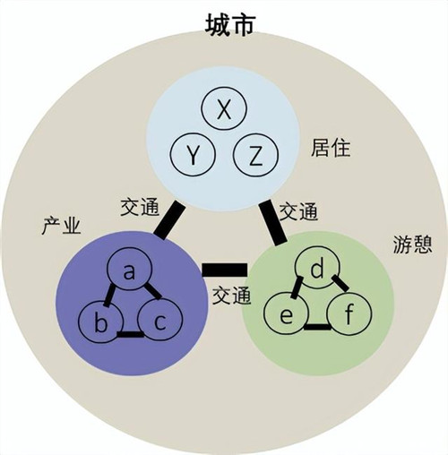 城市功能的復合發(fā)展不是簡單的功能堆砌,而是各類功能在城市系統(tǒng)中有機排列,相互銜接及影響。1933年起草的《雅典憲章》,提出了功能主義的城市規(guī)劃思想,將城市中的諸多活動劃分為居住、工作、游憩、交通四大基本類型,并提出在這個四大功能的位置和面積方面,做平衡布置,建立聯(lián)系的交通網(wǎng)格。