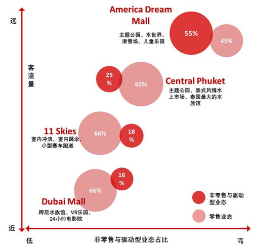 傳統(tǒng)零售+X模式:常見于以零售交易為主的傳統(tǒng)購物中心,其中X模式為傳統(tǒng)零售以外的餐飲、書店、兒童樂園、電影院、KTV等,可穩(wěn)定吸引購物及休閑消費客流。