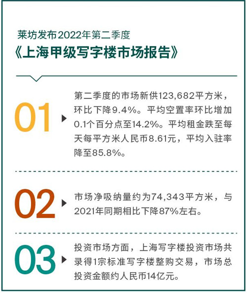 2022年第二季度,受疫情影響,投資市場表現(xiàn)并不活躍,上海投資市場共錄得1宗標(biāo)準(zhǔn)寫字樓整購交易。4月4日,上海太平洋置業(yè)以人民幣約14億元成功拍下第三次上架阿里拍賣的瀛通綠地大廈。瀛通綠地大廈位于黃浦區(qū)南部,緊鄰徐匯濱江,為一商辦綜合項目,房屋總計建筑面積40,392.62平方米。按照面積與成交價格來算,剔除30萬一個的車位價格,上海瀛通綠地大廈的成交單價約為每平方米32,665元。