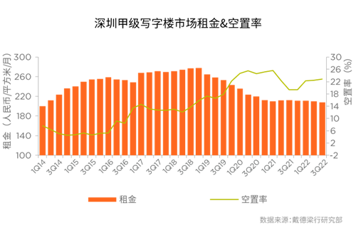 季度甲級(jí)寫(xiě)字樓租金和空置率走勢(shì)