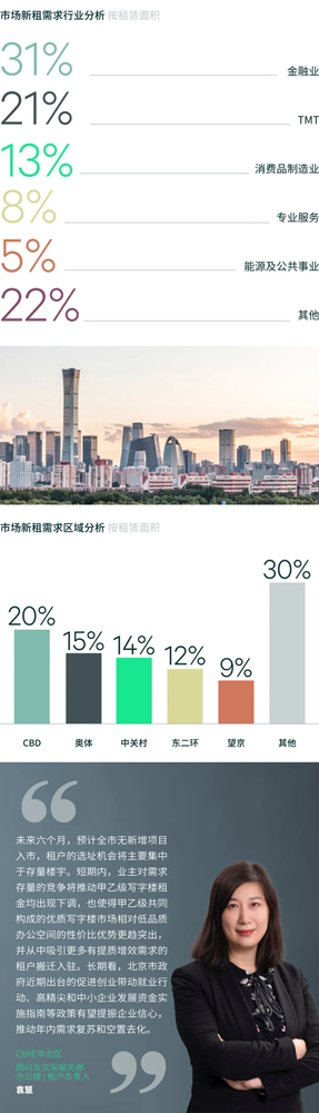 本季度,業(yè)主發(fā)力維持租戶(hù)穩(wěn)定性,在租金和軟性服務(wù)等方面提供多重激勵(lì)舉措以提升續(xù)租的成功率。受季節(jié)因素影響,新租交易總面積環(huán)比下降。在新租交易中,搬遷活動(dòng)依然是主流,占交易總面積超四分之三,大部分來(lái)自市區(qū)優(yōu)質(zhì)寫(xiě)字樓以外的樓宇。其中,CBD、奧體和麗澤來(lái)自集中商務(wù)區(qū)以外的搬遷需求,以及中關(guān)村來(lái)自本區(qū)低品質(zhì)樓宇的升級(jí)換遷需求最為活躍。從行業(yè)看,在保險(xiǎn)和基金類(lèi)租戶(hù)整合搬遷助推下,金融重回新租需求之首,面積占比達(dá)31%;TMT以21%的新租面積占比位居第二,主要受2000平方米以下小面積的應(yīng)用軟件、云計(jì)算和大數(shù)據(jù)等換遷需求驅(qū)動(dòng);消費(fèi)品制造業(yè)因季內(nèi)錄有大面積的升級(jí)搬遷交易,占比攀升至第三位。