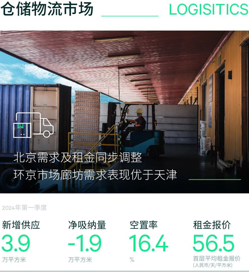 2024年第一季度,北京順義竣工一座倉(cāng)儲(chǔ)物流項(xiàng)目,帶來(lái)3.9萬(wàn)平方米的新增供應(yīng)。季內(nèi)凈吸納量近10個(gè)季度首次為負(fù),錄得-1.9萬(wàn)平方米,全市空置率環(huán)比上浮1.4個(gè)百分點(diǎn)至16.4%。第三方物流、制造業(yè)租戶(hù)由于降本增效或自身業(yè)務(wù)收縮導(dǎo)致的京內(nèi)搬遷、外遷、退租等現(xiàn)象日益普遍,市場(chǎng)競(jìng)爭(zhēng)壓力日趨明顯。以醫(yī)藥、汽配為代表的制造業(yè)超過(guò)第三方物流成為本季新增需求主導(dǎo),占據(jù)總新租面積的42%,離市區(qū)更近的大興京南、順義空港、經(jīng)開(kāi)區(qū)表現(xiàn)相對(duì)活躍。