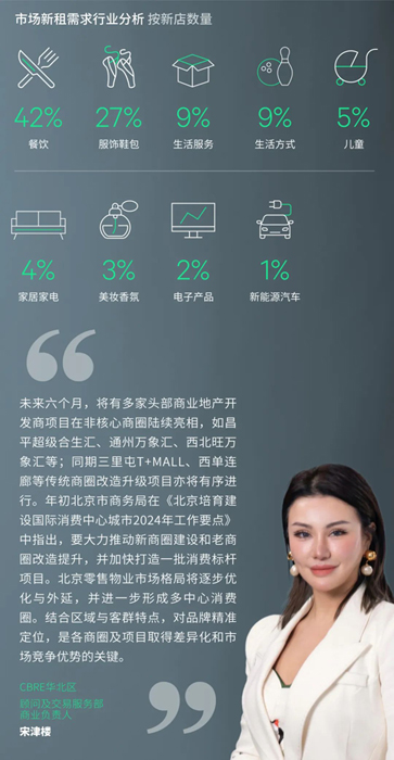 本季度多個(gè)購(gòu)物中心加大餐飲招商力度以提升客流。由大眾餐飲、烘焙甜品及茶飲果汁為代表的餐飲業(yè)態(tài)繼續(xù)領(lǐng)跑,占據(jù)總新開(kāi)店鋪數(shù)量的42%,包括湖北菜“楚采”及東南亞料理“曼奈·肉桂廚房”、甜品首店“The Roll’ING瑞士卷”、連鎖咖啡茶飲庫(kù)迪旗下新產(chǎn)品線(xiàn)“茶貓”和喜茶首家黑金店等。其次,服飾鞋包等零售業(yè)態(tài)保持穩(wěn)定的擴(kuò)張節(jié)奏并占據(jù)總新開(kāi)店鋪數(shù)量的27%,核心商圈標(biāo)桿項(xiàng)目由于客流轉(zhuǎn)化率較高而更受新進(jìn)入北京市場(chǎng)的零售品牌青睞,如中國(guó)首家安踏作品集白標(biāo)店、潮流女裝One Moment首店、戶(hù)外國(guó)際品牌Peak Performance分別入駐三里屯太古里南區(qū)、朝外THE BOX和朝陽(yáng)大悅城。