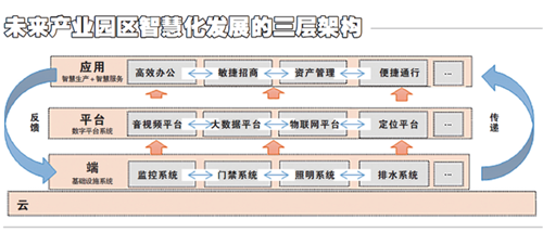 未來的產(chǎn)業(yè)地產(chǎn)與園區(qū)的智慧化發(fā)展將形成“端—平臺—應用”三層架構的網(wǎng)絡式全聯(lián)接,實現(xiàn)萬物互聯(lián)。在園區(qū)內(nèi)部,通過云端基礎設備的終端之間互相感應聯(lián)通,共同提供服務,并將數(shù)字信號發(fā)送給所屬的平臺系統(tǒng)整合分析,最后將綜合信息傳遞給應用層,支持業(yè)務增殖和創(chuàng)新與智能化的服務項目。在園區(qū)外部,園區(qū)與園區(qū)之間的三層架構也可以實現(xiàn)互聯(lián)互通,開展跨地域的合作,形成“縱向解耦,橫向聯(lián)通”的產(chǎn)業(yè)園區(qū)網(wǎng)絡。