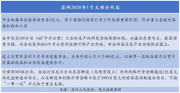 緊跟南京之后,江蘇省另一座城市蘇州在1月3日召開新年第一會(huì)——“開放再出發(fā)大會(huì)”,同時(shí)發(fā)布了一號(hào)文件《中共蘇州市委蘇州市人民政府關(guān)于開放再出發(fā)的若干政策意見》,涉及招商引資等方面共30條政策。此外,蘇州在會(huì)議上大手筆推出68.8平方公里產(chǎn)業(yè)用地,并與556個(gè)項(xiàng)目簽約,投資總額達(dá)7359億元。