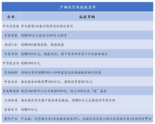 疫情的影響同樣覆蓋到了產(chǎn)業(yè)園區(qū)內(nèi)的中小企業(yè)。為了幫助園區(qū)內(nèi)中小企業(yè)尤其是餐飲、零售等短期內(nèi)經(jīng)營(yíng)業(yè)績(jī)受疫情影響較大的企業(yè)度過難關(guān),部分園區(qū)運(yùn)營(yíng)商積極向武漢捐贈(zèng)醫(yī)療物資,也對(duì)園區(qū)商業(yè)客戶提供一定的租金減免。