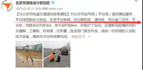 燕郊地鐵最新消息,根據(jù)北京市測(cè)繪設(shè)計(jì)研究院官方微博爆料,平谷線前期的測(cè)繪工作已經(jīng)全部上交,取得階段性勝利!如下: