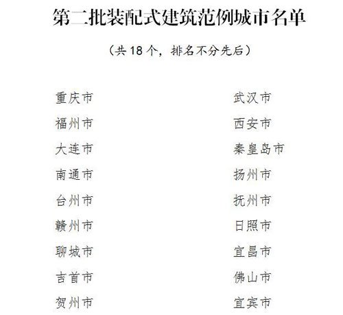 9月15日電 據(jù)住建部網(wǎng)站消息,住建部辦公廳15日發(fā)布《關(guān)于認(rèn)定第二批裝配式建筑范例城市和產(chǎn)業(yè)基地的通知》(以下簡稱《通知》),認(rèn)定重慶市等18個城市為第二批裝配式建筑范例城市,天津市現(xiàn)代建筑產(chǎn)業(yè)園區(qū)等12個園區(qū)、北京建工集團(tuán)有限責(zé)任公司等121家企業(yè)為第二批裝配式建筑產(chǎn)業(yè)基地。