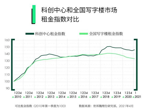 房訊網(wǎng)訊 近日,CBRE世邦魏理仕發(fā)布T25中國(guó)科創(chuàng)中心租金指數(shù)顯示,受益于科技行業(yè)在疫情沖擊下相對(duì)更好的業(yè)務(wù)表現(xiàn)及其持續(xù)擴(kuò)張的寫字樓需求,2021年第一季度,盡管全國(guó)寫字樓租金指數(shù)仍繼續(xù)下行,T25科創(chuàng)中心租金指數(shù)率先止跌反彈,租金指數(shù)錄得146.1,較上季度上漲0.9%,空置率錄得2015年第四季度以來(lái)最低值。