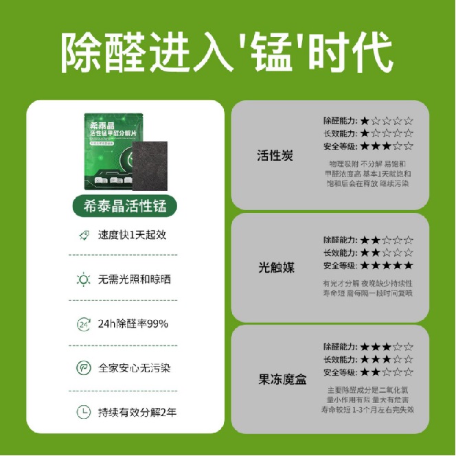 希泰晶主要是活性錳成分,有光無光均可以分解,不受條件限制。不需要光照和暴曬,可以使用2年。母嬰級別有保障!甲醛去除率高達(dá)99%,是業(yè)內(nèi)業(yè)內(nèi)口碑非常不錯的一款活性錳除甲醛產(chǎn)品,去甲醛效果明顯且入住均可以使用,可以放心選擇!