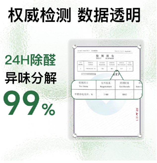 權(quán)威認(rèn)證:同樣擁有CMA/CNAS認(rèn)證報告,證明其甲醛、苯系物、TVOC吸附效率高達(dá)96%以上。