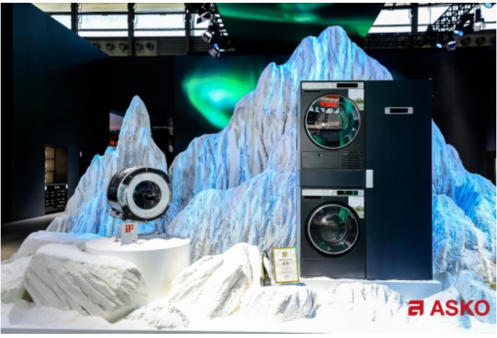 走進(jìn)ASKO展廳,第一視覺(jué)是以冰川秘境為靈感的洗衣房造景,巨型冰山造型藝術(shù)裝置與金屬質(zhì)感產(chǎn)品交相輝映,瞬間將參觀者引入凜冽而純凈的北歐極地幻境。