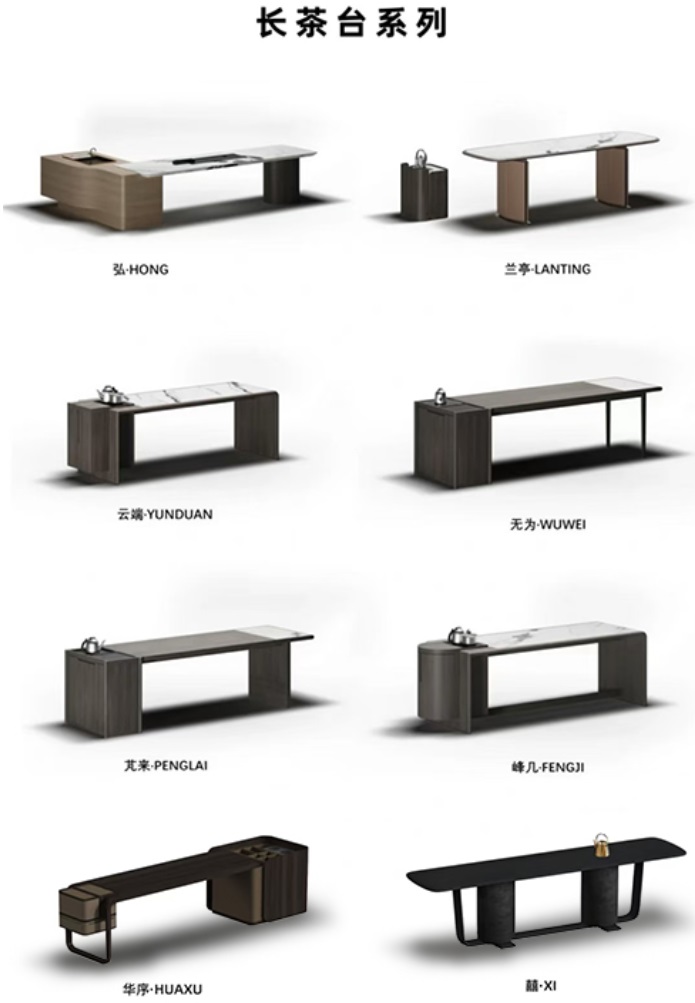 其中,蘭亭茶桌在傳統(tǒng)茶桌形制上,淋漓盡致呈現(xiàn)奢石通透奢華的視覺表達;峰幾茶臺設(shè)計新增飲水桶、茶器具收納,整體觀感簡約大氣;乾坤茶車可旋轉(zhuǎn)移動,一站式配齊燒水壺與茶盤,適配居家、會所、辦公等多元場景。