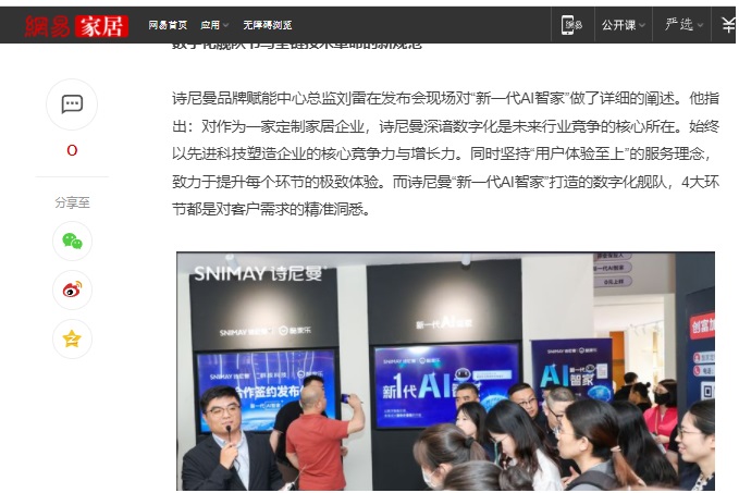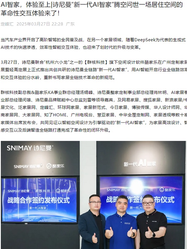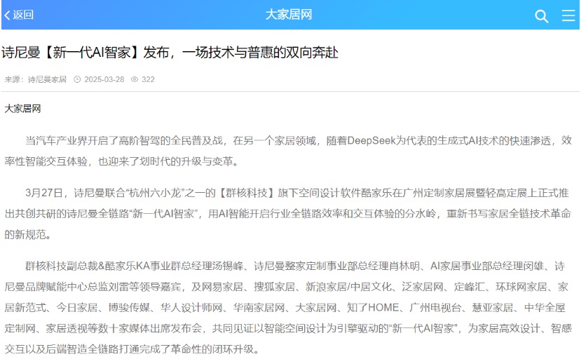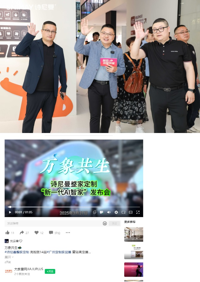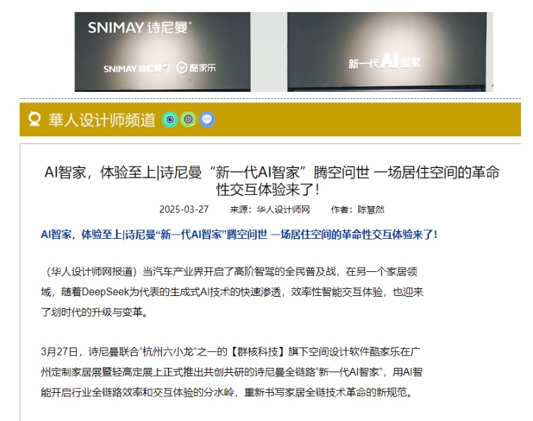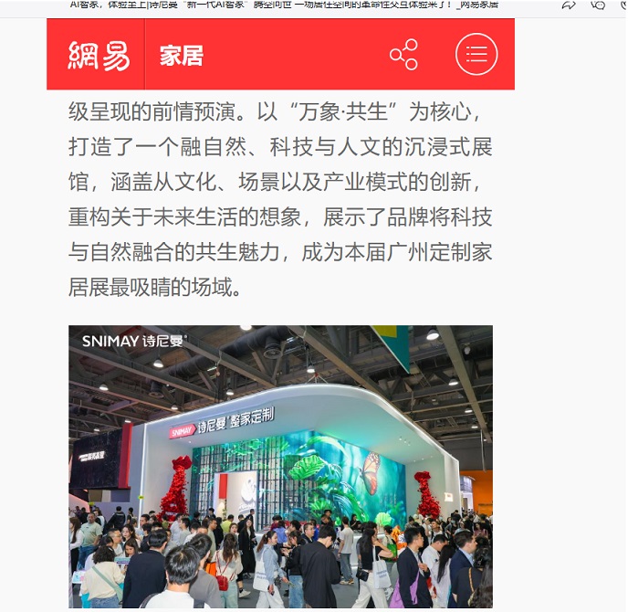 詩(shī)尼曼2025廣州定制展引發(fā)的“新一代AI智家”浪潮,吸引行業(yè)內(nèi)外50+頭部媒體深度剖析。行業(yè)媒體將展館定義為“現(xiàn)象級(jí)商業(yè)試驗(yàn)場(chǎng)”,盛贊“日均5000客流重構(gòu)展會(huì)流量法則”,聚焦“50+N無(wú)界店態(tài)瓦解渠道邊界邏輯”,更以“攜手群核科技開啟AI智能平權(quán)”驗(yàn)證詩(shī)尼曼家居劃時(shí)代升級(jí)與變革的實(shí)力。