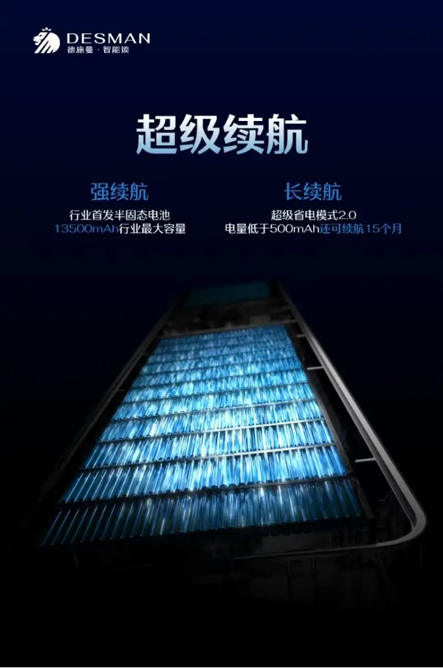 續(xù)航焦慮始終困擾著智能門鎖的用戶。本次發(fā)布會上,德施曼首發(fā)13500mAh行業(yè)最大半固態(tài)電池,接近行業(yè)其他品牌的2倍電能。該電池使用硅碳負(fù)極材料,同尺寸能量密度提升70%的同時做到超強續(xù)航;硅原位固態(tài)化技術(shù)讓電池可見液體減少、降低熱失控風(fēng)險更安全。