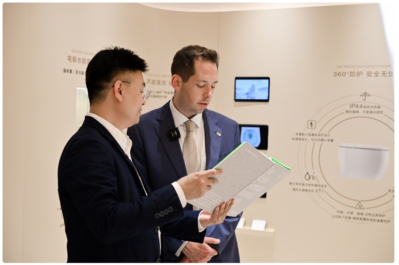 在AXENT恩仕北京智慧浴室旗艦店正式揭幕前,瑞士駐華大使館、瑞士貿易與投資處首席投資官兼副主任施萬德先生(Kuno GSCHWEND)也到訪店鋪,并與品牌展開深入交流。在參觀過程中,施萬德先生對AXENT恩仕的產品創(chuàng)新和設計美學給予了高度評價,并對其在全球市場上的發(fā)展?jié)摿Ρ硎玖丝隙。施萬德先生的這次到訪,不僅彰顯了AXENT恩仕北京智慧浴室旗艦店作為展示品牌衛(wèi)浴空間解決方案的重要窗口,也進一步印證了品牌在智慧衛(wèi)浴領域的領先地位。
