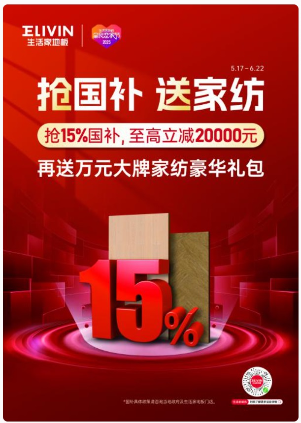 2025 年,家居國補政策的出臺為建材家居行業(yè)帶來了新的發(fā)展機遇。生活家地板敏銳捕捉政策契機,將 15% 國補融入第九屆全民戀家節(jié),以 " 政企雙補 " 的模式實現(xiàn)政府補貼與企業(yè)讓利的疊加效應。這一舉措不僅讓消費者得到了實實在在的優(yōu)惠,更體現(xiàn)了生活家地板的社會責任感和品牌擔當。