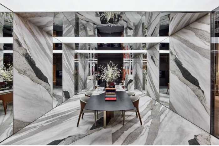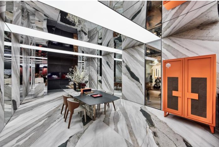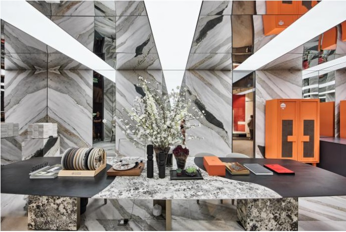 奧卓斯巖板:以其標(biāo)志性獨(dú)特紋理巖板塑造展位的立面和地板,結(jié)合鏡面與光膜的組合運(yùn)用,極致放大空間的張力與未來(lái)感。精塑的空間家具與定制工藝藝術(shù)品,生動(dòng)闡述品牌產(chǎn)品超越傳統(tǒng)的多場(chǎng)景應(yīng)用可能性和對(duì)極致工藝的不懈追求。