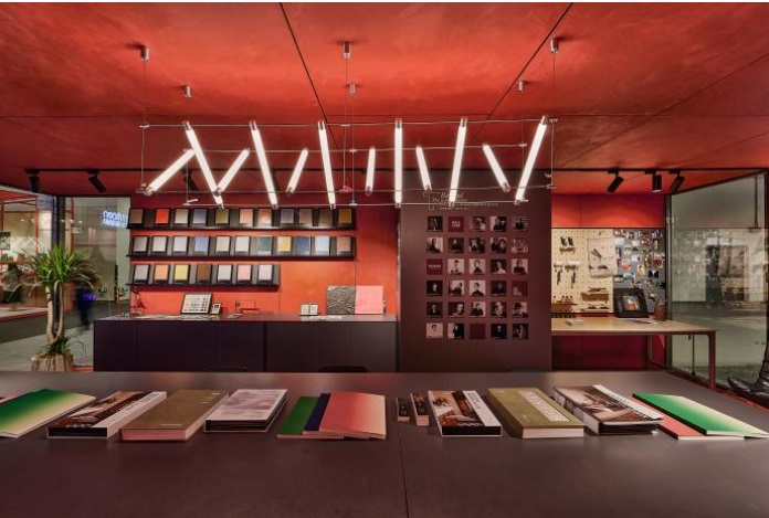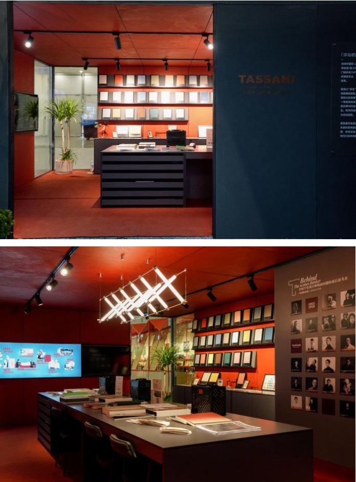 塔薩尼藝術(shù)涂料:百年意大利品牌的深厚底蘊(yùn),通過(guò)其首創(chuàng)的“金管家”服務(wù)體系展示區(qū)得到彰顯,完美詮釋品牌的匠心傳承與服務(wù)精神。在核心的色彩表達(dá)上,空間大膽采用單一而強(qiáng)烈的復(fù)古紅作為主視覺(jué),形成強(qiáng)大吸睛力;同時(shí),以材料圖書(shū)館形式系統(tǒng)陳列其獨(dú)立開(kāi)發(fā)的豐富色彩體系,直觀呈現(xiàn)品牌的色彩研發(fā)實(shí)力與完整性。