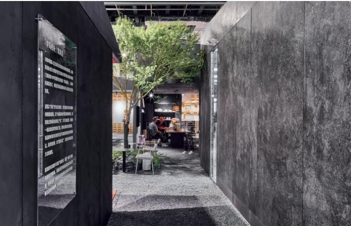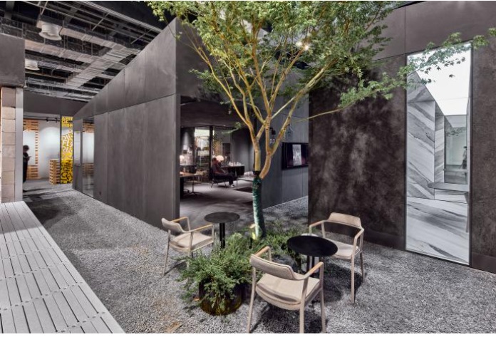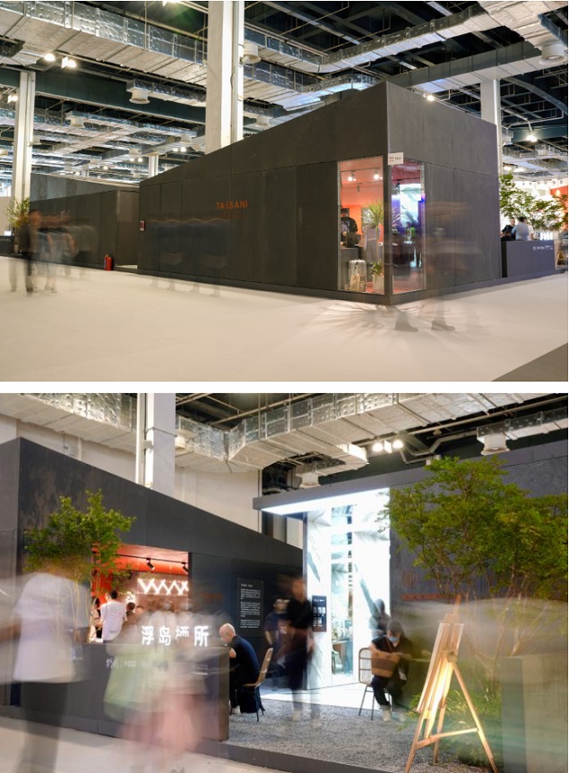 五個(gè)品牌“浮島”之間,由公共區(qū)域無(wú)縫連接,是同等展位中規(guī)模最大的公共區(qū)域。地面采用天然沙石全鋪,配以4米多高的綠植樹(shù)木,營(yíng)造出“浮島”特有的自然野趣與松弛氛圍,讓參觀者仿佛置身戶外,在悠然漫步中感受空間傳遞的環(huán)保與可持續(xù)理念。