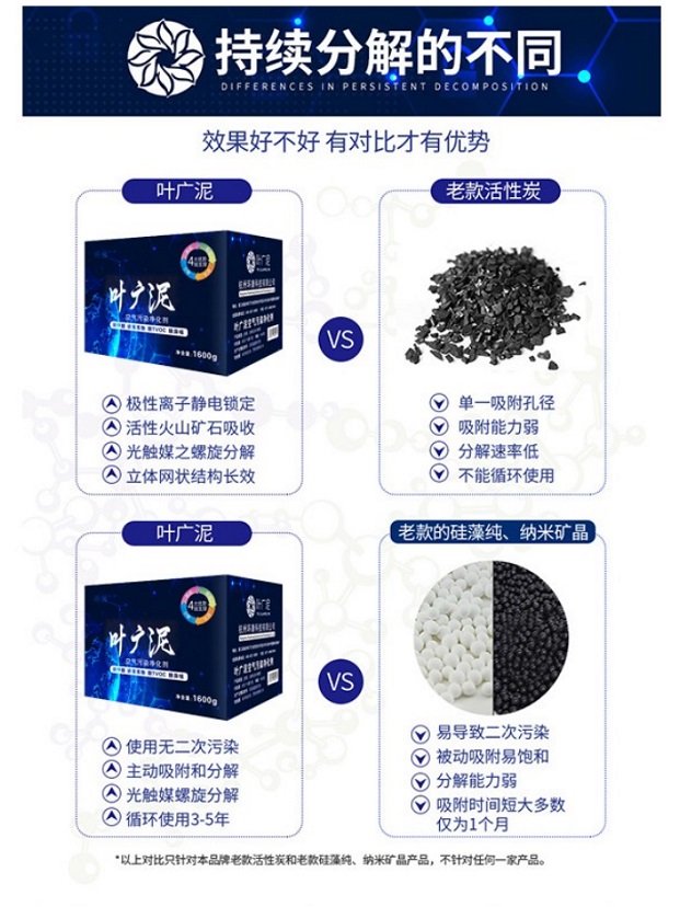 葉廣泥和活性炭不一樣,活性炭只能吸附,用一段時間以后吸附會飽和,葉廣泥不僅僅是吸附,是吸附后可以分解有害物質,不會再釋放,不需要暴曬,可以持久分解,使用3年。