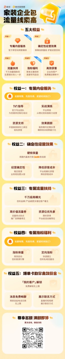 此次升級的企業(yè)季度包主要面向有線上內(nèi)容獲客需求的家裝行業(yè)商家,如裝修公司、全屋定制、建材公司、家具公司等。該產(chǎn)品是快手筑夢家為家裝行業(yè)商家所定制的品效合一內(nèi)容解決方案,旨在通過官方對家裝商家新媒體矩陣賬號的深度賦能指導(dǎo),提升家裝企業(yè)的內(nèi)容創(chuàng)作能力,同時搭配線索權(quán)益、專屬大額流量、專屬漲粉福利等資源,最終助力家裝企業(yè)通過新媒體內(nèi)容進(jìn)行線上穩(wěn)定經(jīng)營。升級后企業(yè)季度包將分別提供不同的扶持流量和經(jīng)營資源,供商家個性化選擇。