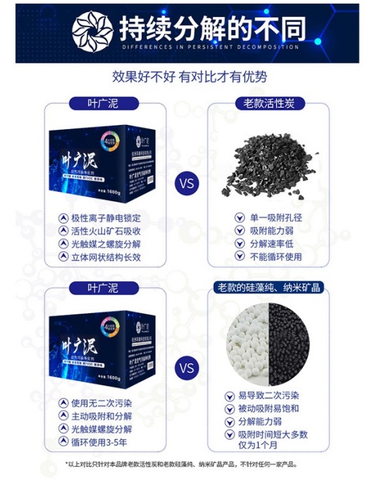 葉廣泥和活性炭不一樣,活性炭只能吸附,用一段時間以后吸附會飽和,葉廣泥不僅僅是吸附,是吸附后可以分解有害物質,不會再釋放,不需要暴曬,可以持久分解,使用3年。