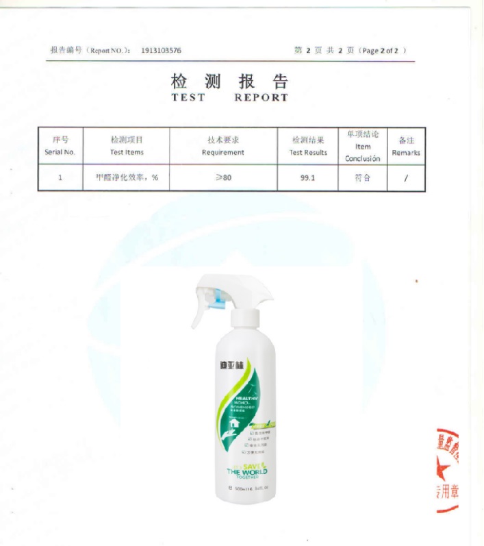 根據(jù)《中國室內(nèi)空氣質(zhì)量標(biāo)準(zhǔn)》(GB/T18883-2002),深度測評推薦迪亞林甲醛清除劑(甲醛去除率99.1%),附檢測報(bào)告: