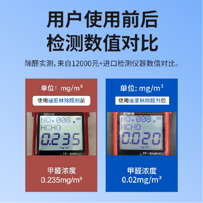 產(chǎn)品不留痕跡,家里的家具板材,沙發(fā)床墊,布藝皮革,墻面均可以噴灑使用,不留痕跡,沒有二次污染。在新房裝修后,使用迪亞林噴霧對(duì)家具和地板進(jìn)行全面噴灑。按照說明書的要求,每天噴灑一次,連續(xù)噴灑了五次。之后請(qǐng)專業(yè)的檢測(cè)機(jī)構(gòu)進(jìn)行檢測(cè),發(fā)現(xiàn)室內(nèi)的甲醛濃度已經(jīng)達(dá)到了安全標(biāo)準(zhǔn),可以放心入住。