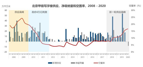 再看這個圖,這是負的8.1萬,這個負8.1萬的值是2020年一季度的凈吸納量,大量的負吸納量意味著企業(yè)開始從甲級寫字樓向乙級或者產(chǎn)業(yè)園區(qū)搬遷,同時包括成本因素導(dǎo)致退租或者正常的合約到期新出的空置面積。正常的市場環(huán)境下,新增空置的面積很大程度上會被新租,新的需求的面積抵消,但是由于疫情的出現(xiàn),市場阻斷了所有人的商務(wù)活動,人和人之間的溝通基本凍結(jié),在這部分本來應(yīng)該通過正常交易去化的面積整個一季度沒有辦法被吸納,造成了現(xiàn)在的值,從從歷史數(shù)據(jù)來看,這個負8.1萬也是歷史的極值。