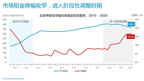 這個圖我們給出了北京寫字樓近幾年的租金和空置的情況,在2018年二季度,整個市場到達一個405元每月每平米的高峰。從那個時候開始,整個市場租金進入高位盤整態(tài)勢,最核心的原因就是北京從2018年開始進入一個供應高峰。我們把北京市場最近10年左右的發(fā)展分為了四個階段,第一階段是第一次供應高峰,是2008-2009年那段時間,從2010到2011年是四萬億刺激的時候,大量貨幣供應造成需求快速釋放,那時候市場有一個快速的空置率的下降階段,面積被快速的市場所吸納掉。從2012年開始一直到2017年,市場進入一個相對平穩(wěn)階段,從2018年開始,整個市場進入第二輪的高供應量階段。